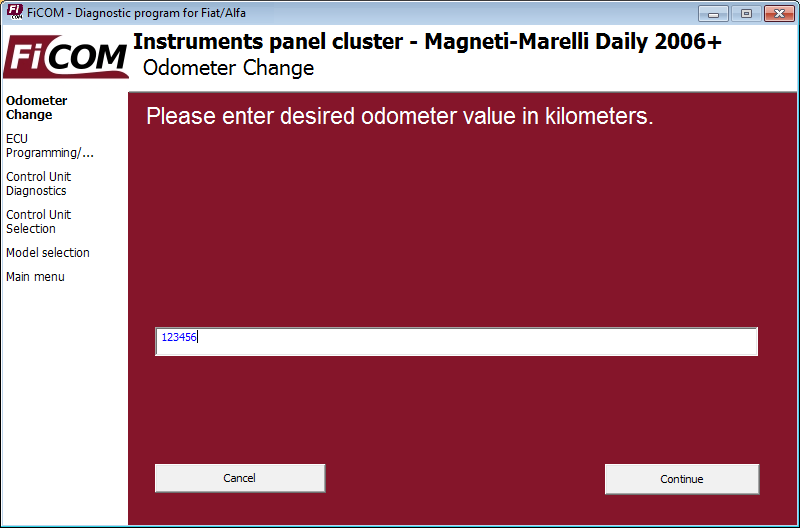 You will be prompted to entering of desired value (in km) that you wish to set to odometer. Then press “Continue” to finish the coding operation.